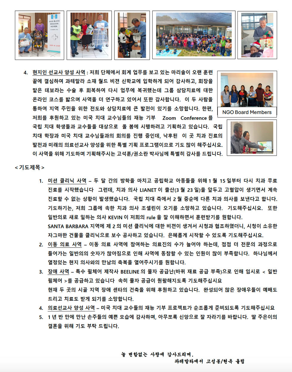 미션 클리닉 사역 – 두 달 간의 방학을 마치고 공립학교 아동들을 위해1월 15일부터 다시 치과 무료 진료를 시작했습니다 그런데, 치과 의사 LIANET이 출산(3월 23일)을 앞두고 고혈압이 생기면서 계속 진료할 수 없는 상황이 발생했습니다. 국립 치대 측에서 2월 중순에 다른 치과 의사를 보낸다고 합니다. 기도하기는, 저희 그룹에 속한 치과 의사 조셀린이 오기를 소망하고 있습니다. 기도해주십시요. 또한 일반의로 새로 일하는 의사 KEVIN이 저희의 rule을 잘 이해하면서 훈련받기를 원합니다. SANTA BARBARA 지역에 제 2의 미션 클리닉에 대한 비젼이 생겨서 시청과 협조하였더니, 시청이 소유한 자그마한 건물을 클리닉으로 보수 공사하고 있습니다. 은혜롭게 시작할 수 있도록 기도해주십시요.